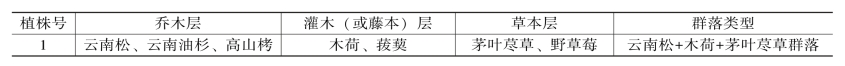 由表可知,云南拟单性木兰的群落类型为云南松+木荷+茅叶荩草群落,其生活型为:共有伴生植物7种,其中,乔木层有3种,占42.86%,灌木层有2种,占28.57%,草本层有2种,占28.57%。