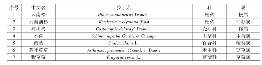 由表可知,云南拟单性木兰生活的群落植物分属7科7属7种。