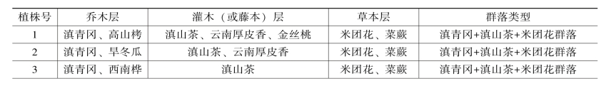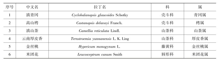 由表可知,伯乐树的群落类型为滇青冈+滇山茶+米团花群落,其生活型为:共有伴生植物9种,其中,乔木层有4种,占44.44%,灌木层有3种,占33.33%,草本层有2种,占22.22%。