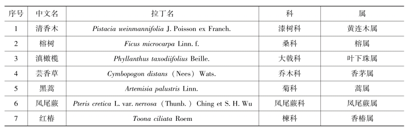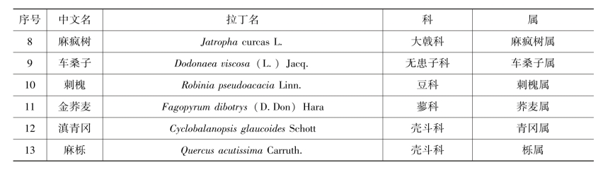 由表可知,元江苏铁生活的群落植物分属11科13属13种。