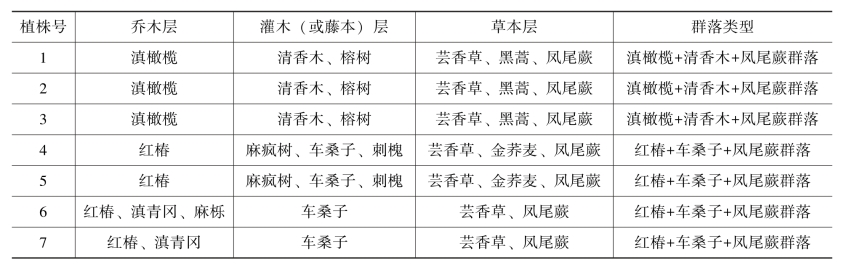 7.坡向:元江苏铁的坡向有2类,1号、2号、3号、6号和7号为东向,占71.43%,4号和5号植株为西向,占28.57%。