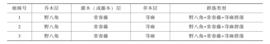 由表可知,水青树的群落类型为野八角+常春藤+荨麻群落,其生活型为:共有伴生植物3种,其中,乔木层有1种,占33.33%,灌木层有1种,占33.33%,草本层有1种,占33.33%。