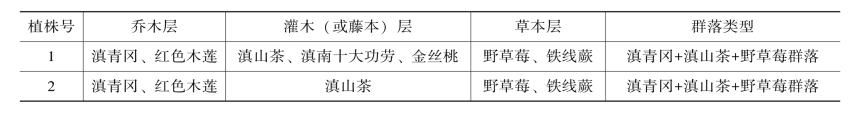 由表可知,水青树的群落类型为滇青冈+滇山茶+野草莓群落,其生活型为:共有伴生植物7种,其中,乔木层有2种,占28.57%,灌木层有3种,占42.86%,草本层有2种,占28.57%。