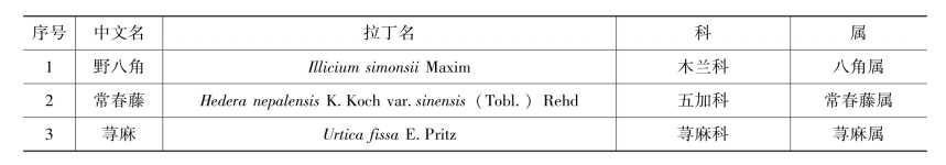 由表可知,水青树生活的群落植物分属3科3属3种。