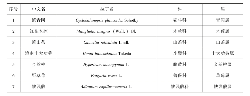 由表可知,水青树生活的群落植物分属7科7属7种。