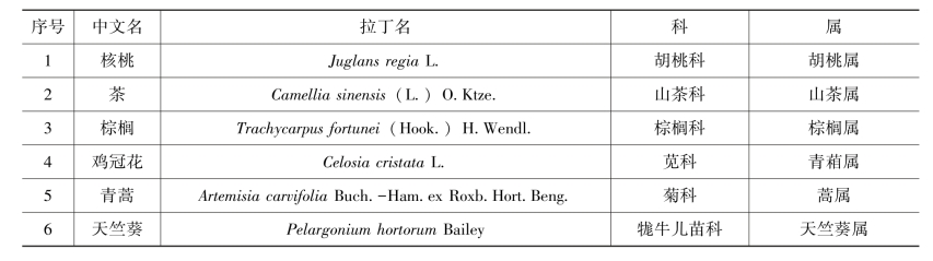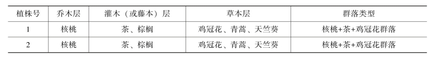 由表可知,银杏的群落类型为核桃+茶+鸡冠花群落,其生活型为:共有伴生植物6种,其中,乔木层有1种,占16.67%,灌木层有2种,占33.33%,草本层有3种,占50.00%。
