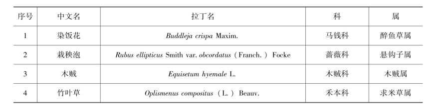 由表可知,银杏生活的群落植物分属4科4属4种。