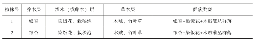 由表可知,银杏的群落类型为银杏+染饭花+木贼灌丛群落,其生活型为:共有植物5种,其中,乔木层有1种,占20%,灌木层有2种,占40%,草本层有2种,占40%。