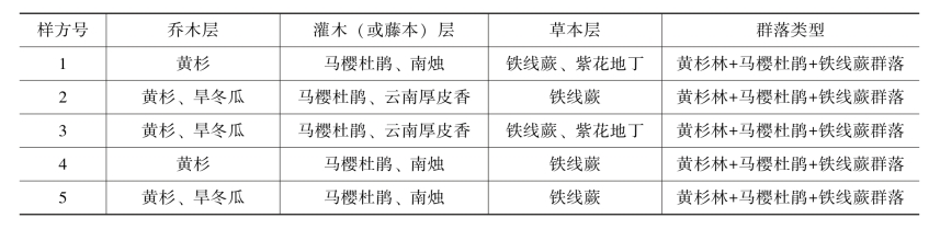 由表可知,黄杉的群落类型为黄杉林+马樱杜鹃+铁线蕨群落,其生活型为:共有植物7种,其中,乔木层有2种,占28.57%,灌木层有3种,占42.86%,草本层有2种,占28.57%。
