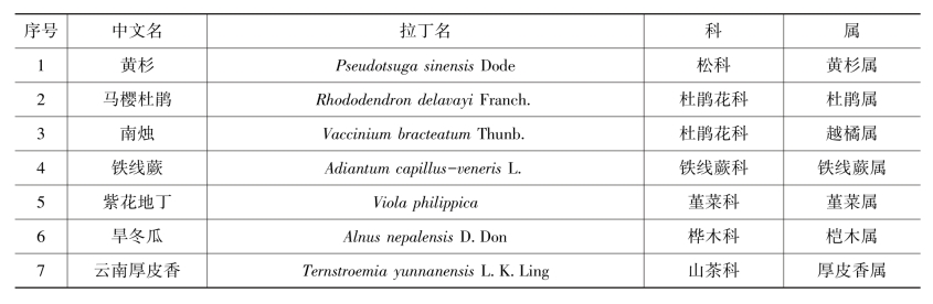 由表可知,黄杉生活的群落植物分属7科7属7种。