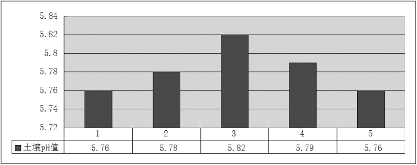 由图可知,黄杉的土壤pH值区间[5.76,5.82],最小值为1号和5号样方,最大值为3号样地。