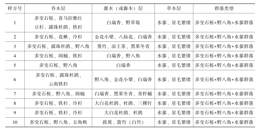 由表可知,喜马拉雅红豆杉的群落类型为多变石栎+野八角+水蓼群落,其生活型为:共有植物17种,其中,乔木层有8种,占47.06%,灌木层有7种,占41.18%,草本层有2种,占28.57%。