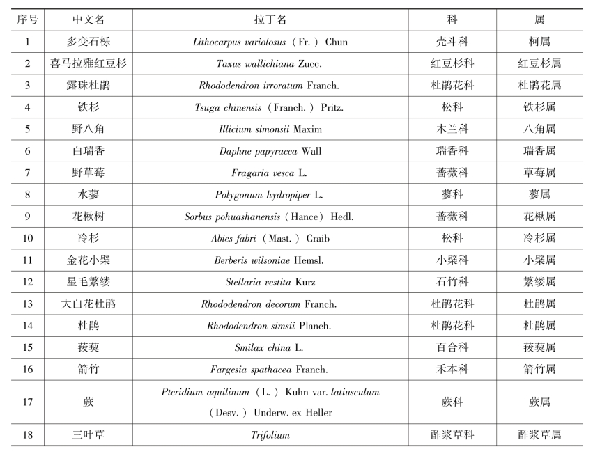 由表可知,喜马拉雅红豆杉生活的群落植物分属15科17属18种。