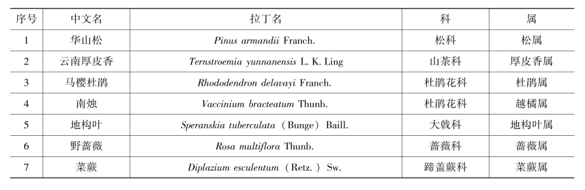 由表可知,喜马拉雅红豆杉生活的群落植物分属6科7属7种。