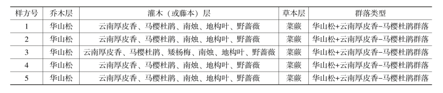由表可知,喜马拉雅红豆杉的群落类型为华山松+云南厚皮香-马樱杜鹃群落,其生活型为:共有伴生植物7种,其中,乔木层有1种,占14.29%,灌木层有5种,占71.43%,草本层有1种,占14.29%。