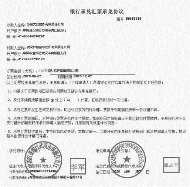 1.6月7日,签发银行承兑汇票。(银行预留印鉴:武汉梦佳窗帘纺织有限责任公司财务专用章和法定代表人私章)