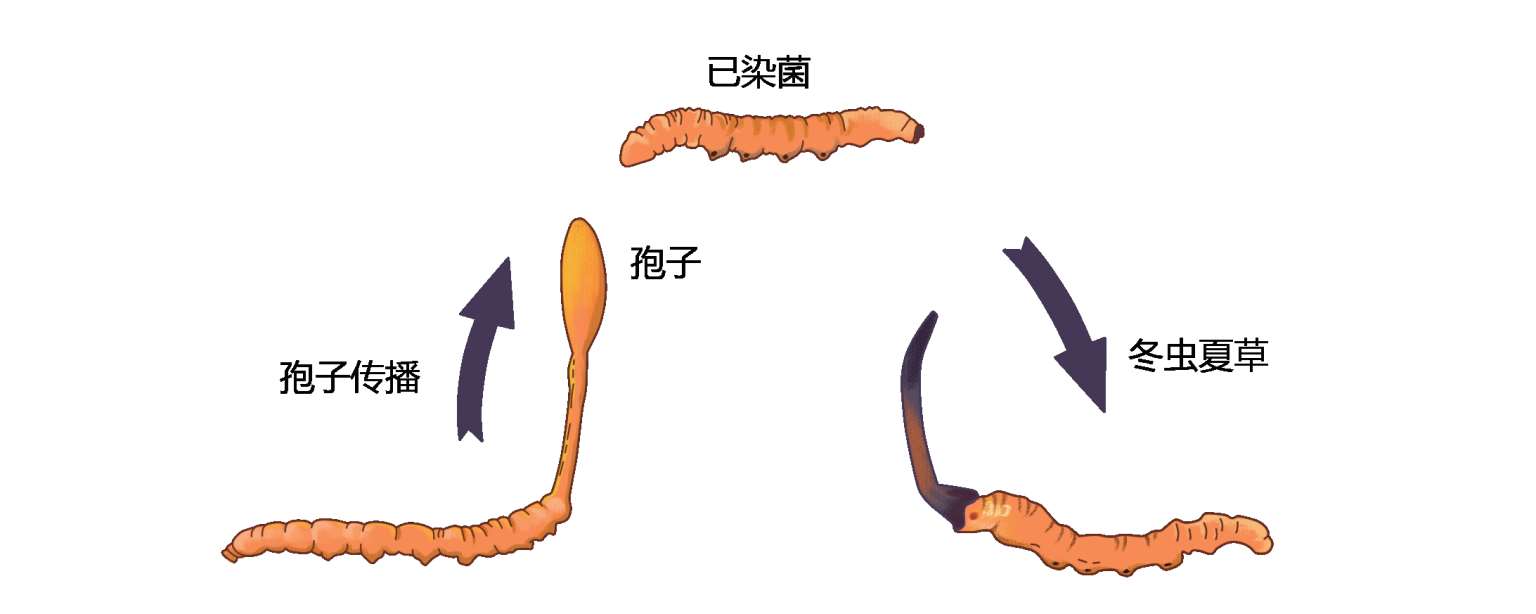 没错,虫草冬天的时候是虫,到了夏天就变成了草。它是昆虫和菌类的混合体。秋天时菌类植物的孢子会四处散落以寻找生根发芽的机会,当它们落到栖息在土上的蝙蝠蛾的幼虫身上时,就会立即钻进虫的体内,然后“生根发芽”长出菌丝,汲取虫的养分。