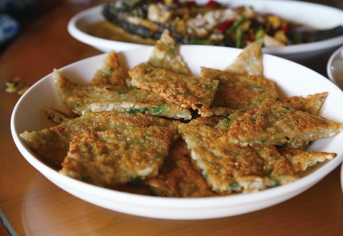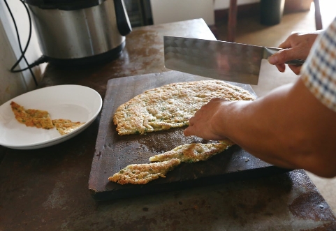 D-1-2 把山粉糊调好的馅料泼到锅里煎