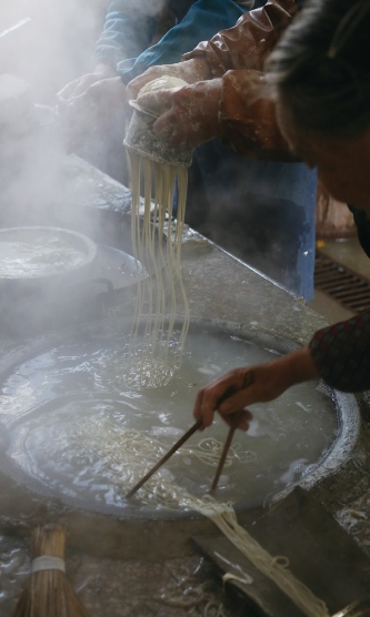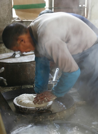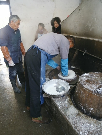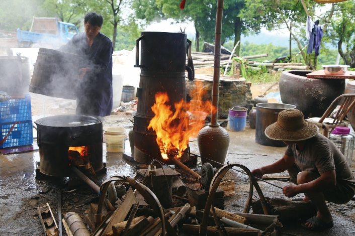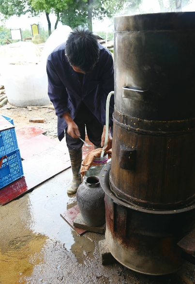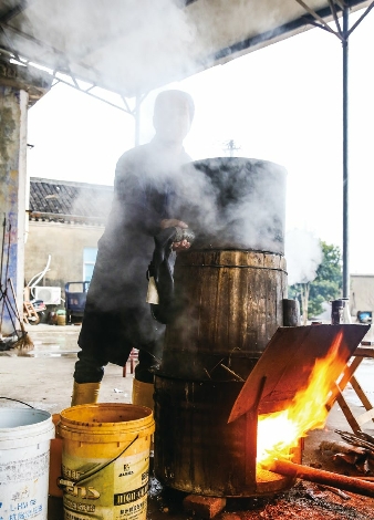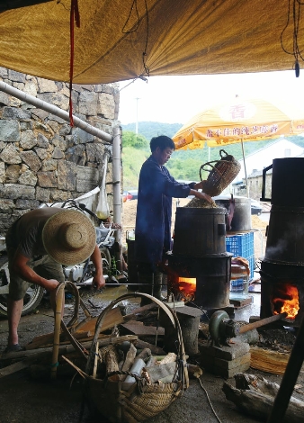 D-1-15 番薯烧白酒制作技艺:先将锡甑架在盛满清水的大铁锅上