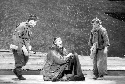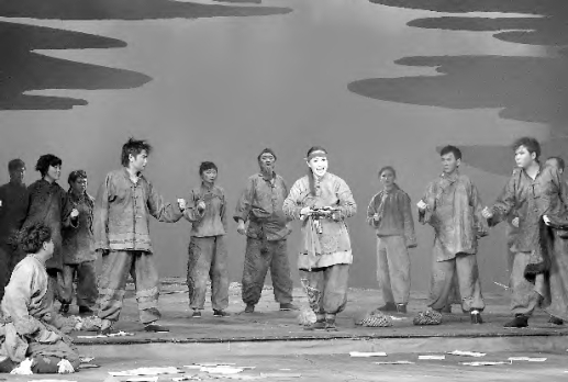 相对于萧红的《生死场》,评剧《我那呼兰河》的故事构架与情节设计明亮了很多,整部戏一扫原著的阴郁,鲁迅对萧红《生死场》的评价“北方人民的对于生的坚强,对于死的挣扎,却往往已经力透纸背”在这部戏中体现得更加明丽。萧红的原著更多的是对东北底层民众的痛苦生活的原生态呈现,小说中的人物“蚁子似地生活着,糊糊涂涂地生殖,乱七八糟地死亡,用自己的血汗自己的生命肥沃了大地,种出粮食,养出畜类,勤勤苦苦地蠕动在自然的暴君和两只脚的暴君底威力下面”(胡风语)。而在评剧《我那呼兰河》中,人物的行为都是有前因后果的,人物关系是逻辑明显的,比如,戏中将金枝改编成王婆的女儿,增加了王婆与赵三的爱情戏,美化了成业,删去了麻面婆等不必要的人物,使得人物关系更加简洁明了,而戏剧内部所呈现的精神特质比之原著也更加向上、更加具有因果性,改变了原著的原生态呈现形式。这样改编的优点是戏剧性加强了,但原著的自由呈现形式中的散射的生活原态所能指示的更多的内在意蕴也就消失了。当然,这并不是说评剧的内在意蕴狭小,而是说,这样一改就更符合戏曲的特点,符合戏曲的呈现特点,便于舞台呈现,获得了一种戏曲呈现的特质:更加戏剧性、明丽、畅快。