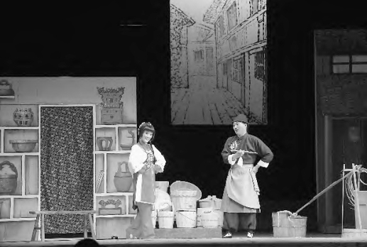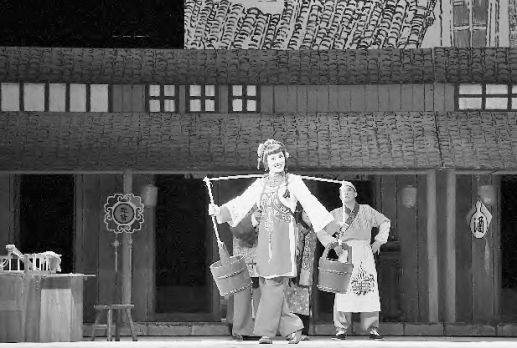 再一个问题就是现代戏曲如何吸取民间元素的精华使之保持原初的活泼生命力问题,浙江越剧团的这部《九斤姑娘》作出了很好的回答。此戏剧情的诙谐以及活泼语言只能是来自民间的,是原初的民间智慧的表现。此戏在道具以及舞台的设置上也尽力利用民间元素,比如对“桶”的呈现等,都是很好的旧元素的利用。这些民间元素对现代观众是有一定吸引力与新鲜感的,说明适合现代观众欣赏习惯的传统元素还是有其生命力的,不可一概否弃。而如何在“现代性改造”与传统元素利用之间找到一条合适的通道,正是我们现代戏曲人应该认真思考的。《九斤姑娘》的成功,也具有和表达了戏曲在当代发展遭遇许多困难后向传统回溯,寻求本真资源以及对现实反思的意味。所以,它的意义不局限于一部作品的改编,而在整个戏曲创作中具有的代表性。这也是当前戏曲发展的一种倾向,包括一些获得中国戏曲学会奖或国家舞台艺术精品工程的作品,如《贬官记》《王茂生进酒》等,这是值得我们关注的。