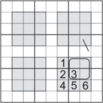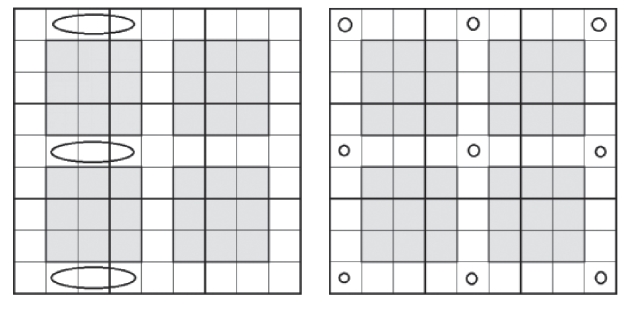 由上文锯齿数独相关技巧,3个椭圆形内是1组1~9。一道题目,有四个这样的宫。我们进一步观察,每道题目是九组1~9,四个窗口宫占据四组,四个LoL宫占据四组,还有一组额外宫,是剩下9个单元格组成的(图13右图所示)。在窗口数独里,一共有十八个宫。