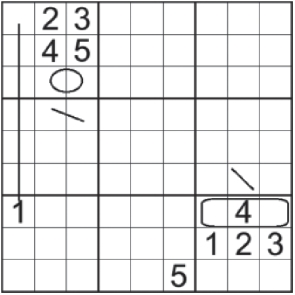 观察图15,第一宫有个1的区块。按照无缘数独的规则,这个区块可以排除D2和D3两个单元格的1,原理大家可以考虑一下。这种特殊区块是无缘数独最常见的。