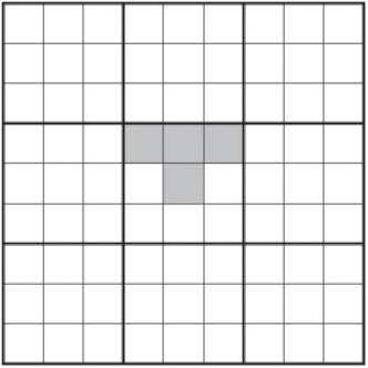 观察图26,在某个案例里,灰色部分是1、4、5、6的数组,那么该怎么填呢?大家可以思考一下,会发现这种T型单元格的中间位置,肯定只能填入1,若填入其他数字都会引发矛盾。