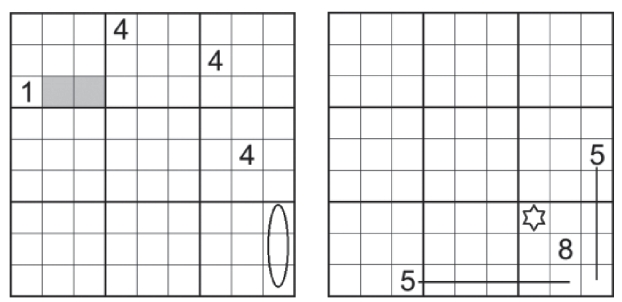 观察图24左图。左上角灰色区域是4的区块,这两个单元格里若有5,那么就是4、5数对,而且是相邻单元格内连续自然数的数对,与题目规则不符,因此这里不能有5,也不能有3,这就是基于连续数独特殊规则的区块删减。
