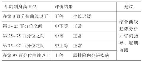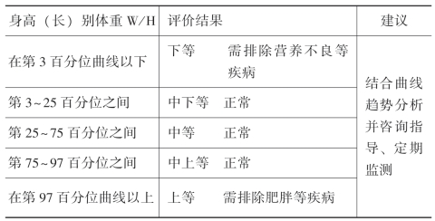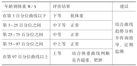 (4)定期评估儿童生长状况:由于体格生长在儿童中的个体差异非常显著,故结合成长曲线对生长水平、生长速度及匀称度进行综合评价非常重要。但当无法获得参数表或生长曲线进行评价时,可根据儿童体格生长的一般规律进行初步评价。