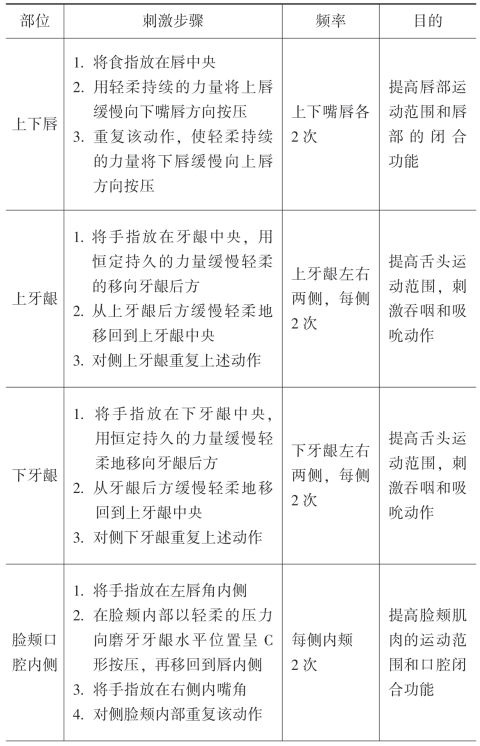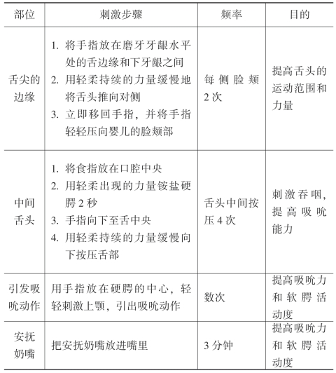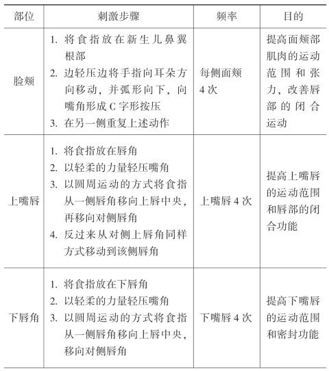 口腔运动干预是指在神经反应较弱的早产儿,吞咽、吸吮障碍的新生儿,在开始经口喂养前或经口喂养过渡阶段,采取口腔内外按摩刺激,非营养性吸吮等刺激,改善口腔机制的生理基础,促进危重新生儿、早产儿口腔发育,提升新生儿吸吮-吞咽-呼吸协调功能,提高喂养效率与质量的一组方法。