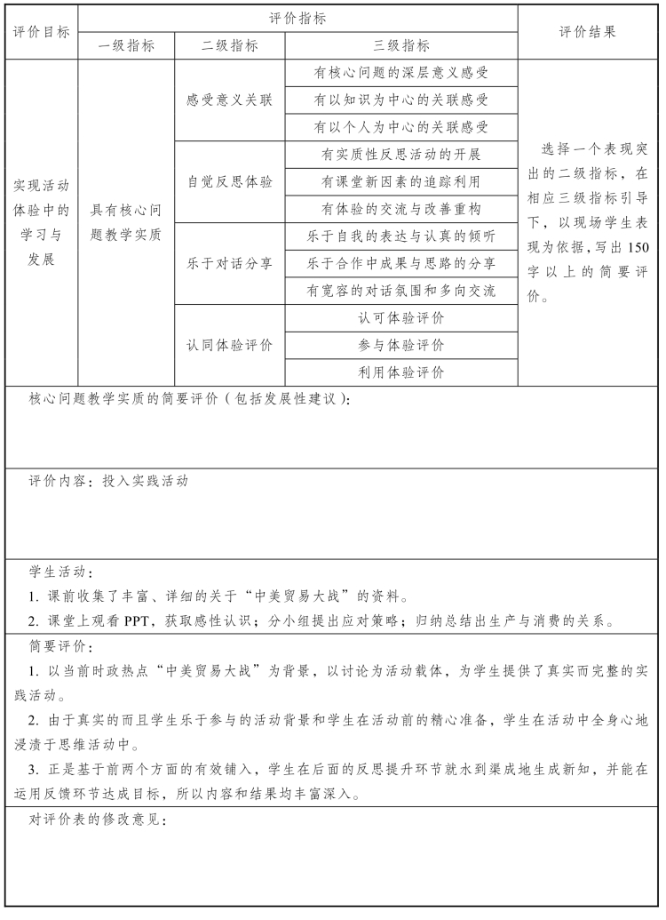 本节课是采用“核心问题教学”的课堂教学模式完成的一节课。课堂里以“分析中美贸易大战中‘打’与‘不打’的原因,探究影响国际关系的主要因素”为核心问题,引领学生在讨论及反思等学习活动中以“中美贸易大战”为载体和背景去体验国家利益与国际关系的关联。从课堂中学生的表现及课堂检测练习的分析来看,基本达成了预期的结果性和体验性目标。