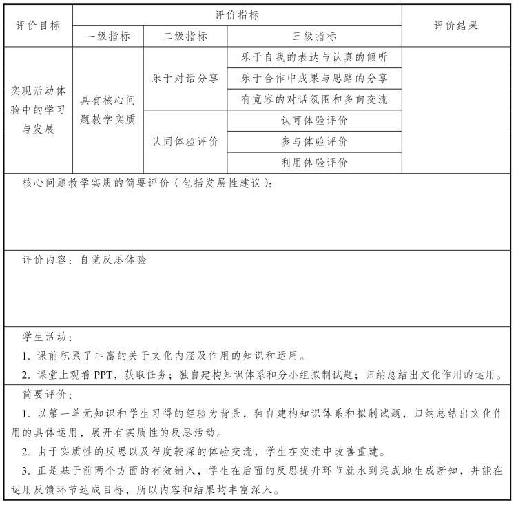 本节课是采用“核心问题教学”的课堂教学模式完成的一节复习课。课堂里以“对考点,建体系,补漏拾遗;翻习题,拟试题,掌握运用”为核心问题,引领学生在反思及交流等学习活动中以“文化内涵及作用”的载体和背景去体验知识与运用的关联。从课堂中学生的表现及课堂检测练习的分析来看,基本达成了预期的结果性和体验性目标。