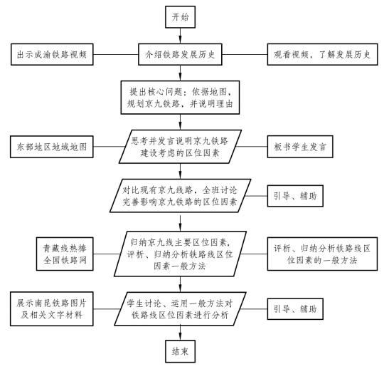 教学过程中围绕核心问题展开活动,我采用了“问题、活动、提升、运用”教学模式,重视学生学习过程中体验的获得:首先,提出核心问题;其次,让学生在核心问题的驱动下进行探讨活动,每位学生通过自己画图设计京九铁路线路,展示分析、交流、合作、综合表达等能力,在此基础上归纳提升出分析铁路线区位因素的一般方法,使学生在充分体验的基础上掌握分析铁路线区位因素的基本思路;最后,选择了教材上比较经典的案例—— 南昆铁路,让学生将前面总结出的分析区位因素的思路和从材料里提取信息的方法运用到分析南昆线的区位因素上,检验学生对交通运输线的布局与地理环境各要素之间关联的体会程度。