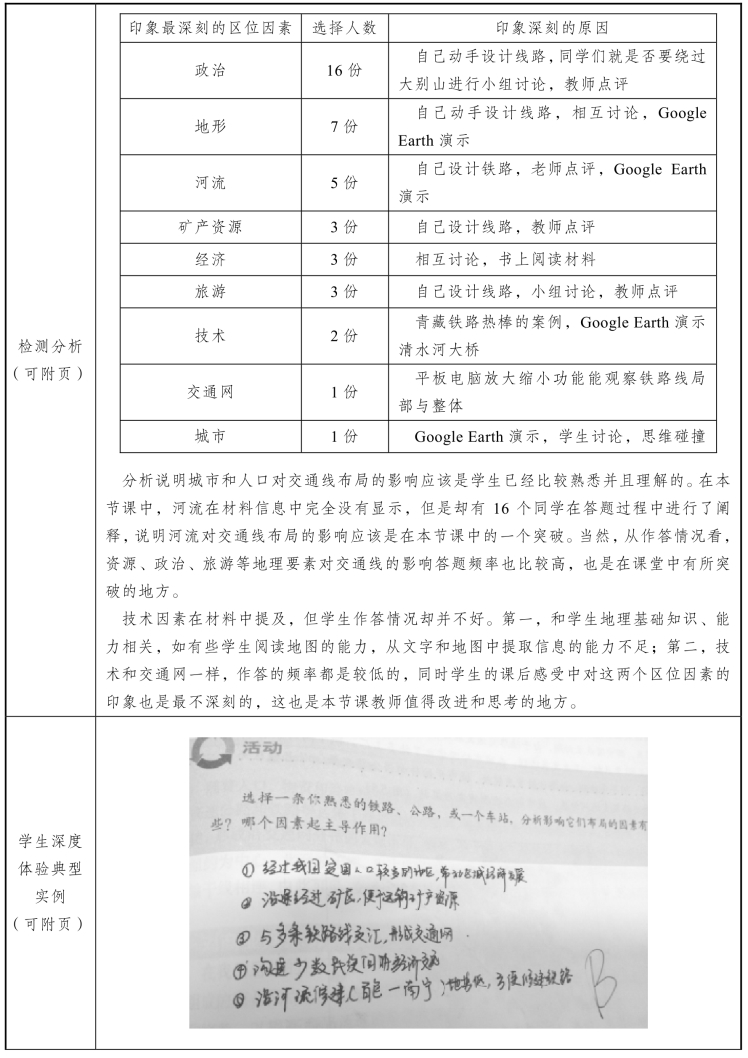 3.运用反馈环节:通过反馈提升,将学生引导到本节课的知识、思想方法中,运用所学知识和方法分析、解决问题。在此环节中,从充分感受交通线的布局和地理环境各要素之间的关联进行评价,以唤起学生对体验关联的深度体验。