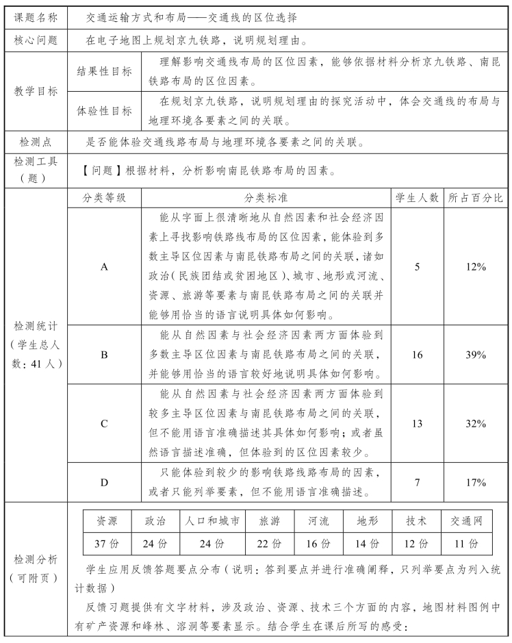 为了检验本节课教学目标的达成情况,教师布置了运用反馈试题“依据材料,分析南昆铁路布局的区位因素”,课后搜集了全班41名同学的学生活动材料记录表。