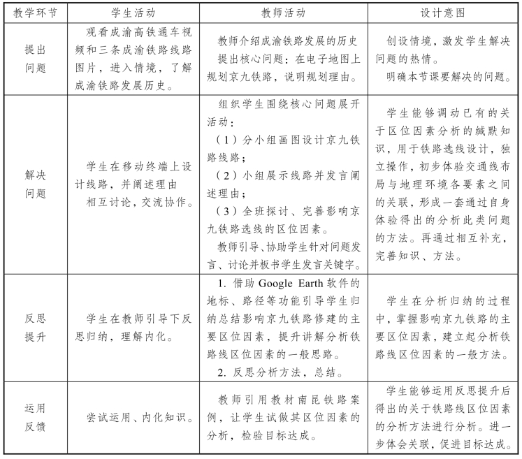 基于现在信息技术和教学课堂的融合逐渐深入,本节课想借助移动终端实现学生设计铁路线的现场交互式学习,以及借助地理软件Google Earth更加形象地让学生理解地形、城市、技术、交通网等因素对地理环境的影响。