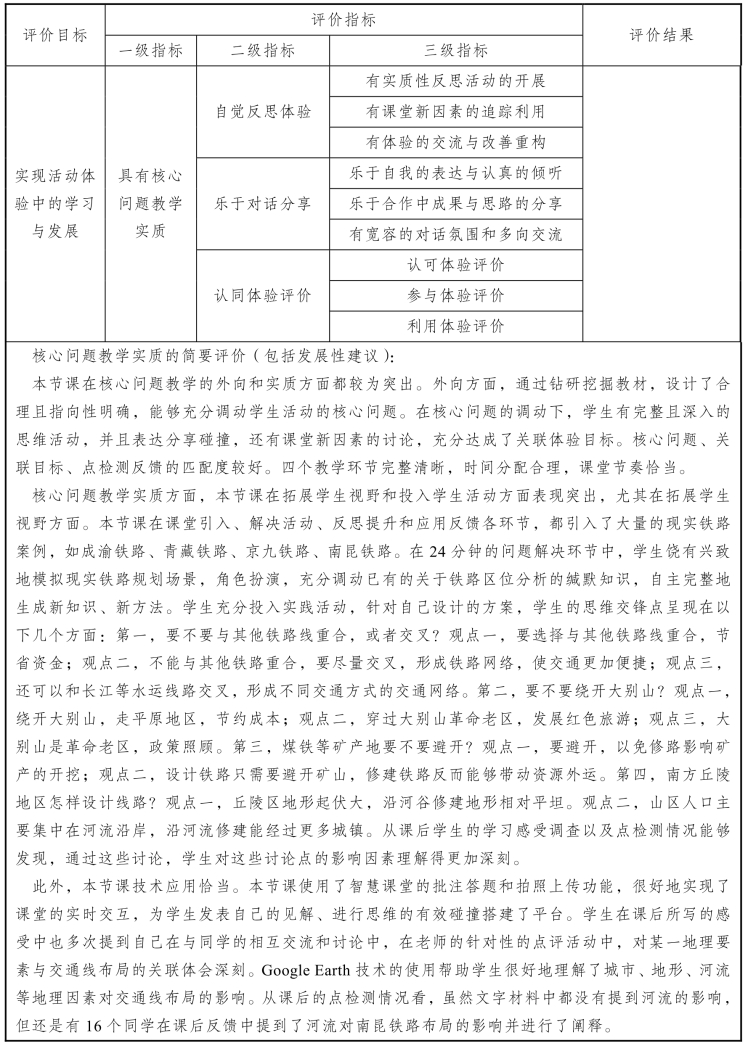 1.解决问题环节:在解决问题的环节中,要注意到以下方面:(1)要充分鼓励学生发言,不要给予诊断性的评价,更多地引导学生体验不同的地理环境要素与交通线布局的关联。(2)学生在分析地图材料时不够细致,可能会忽略图例中的某些信息,教师可以适度引导。(3)学生在阐释某要素对交通线布局影响的时候,有可能对具体如何影响的阐释不够深入,教师可以用追问的方式让学生深度体验关联。(4)在进行评价时,要对学生的积极性、语言的规范性和准确性、是否表述出了体验性目标方面等进行综合评价。