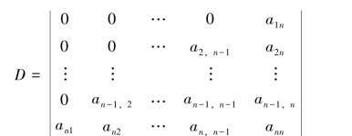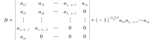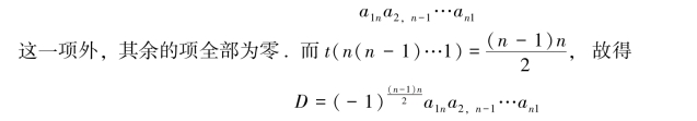 行列式第1行的元素除了a1n可能不为零外其他元素全部为零,因此,仅需要考虑j1=n的那些项.在第2行中,除了a2,n-1和a2n可能不为零外其他元素全部为零,因此,j2只有选取n-1和n这两种可能.由于j1=n,因而j2就不能选取n,只能选取n-1,即j2=n-1.这样逐步推下去,直到jn也只能选取1这一种可能,即jn=1.由此可以看出,在展开式中除了