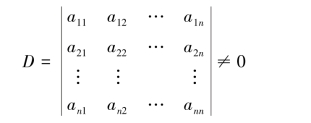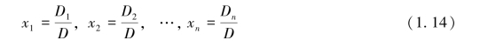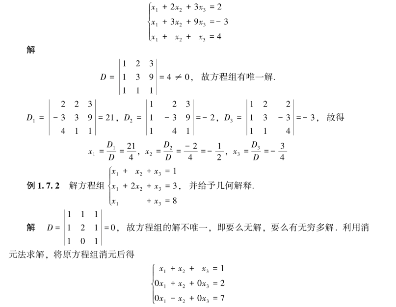 定理1.7.1通常称为克拉默(Cramer)法则,证明详见2.4节.由克拉默法则可知,如果线性方程组(1.13)没有唯一解(即无解或有两组及以上的解),则系数行列式一定为零,即D=0.