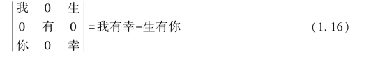式(1.16)称为爱情行列式.通过这个行列式的演练,同学们不仅能加深对角线法则的印象,还能体会到学习线性代数的趣味性.