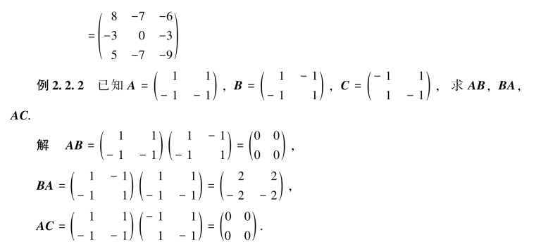 由例2.2.2可知,对于数的乘法成立的运算规律,对于矩阵的乘法并不都成立,值得提出的是以下三点: