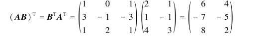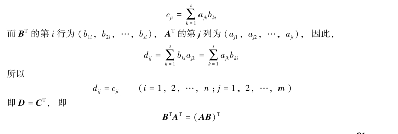 这里仅证明(4).设A=(aij)m×s,B=(bij)s×n,记AB=C=(cij)m×n,BTAT=D=(dij)n×m.则(AB)T的第i行第j列位置上的元素,即原矩阵AB的第j行第i列位置上的元素,它是