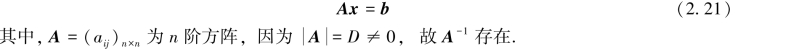 由Ax=b,有A-1Ax=A-1b,即x=A-1b,根据逆矩阵的唯一性可知,x=A-1b是方程组(2.21)的唯一的解向量.
