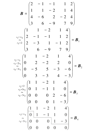 矩阵B4和B5都称为行阶梯形矩阵,其特点:可画出一条阶梯线,线的下方全为0;每个阶梯只有一行,台阶数即为非零行的行数,阶梯线的竖线(每段竖线的长度为一行)后面的第一个元素为非零元,即非零行的第一个非零元.