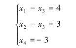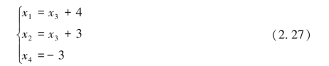 方程组(2.26)是含有4个未知数、3个有效方程的方程组,应有一个自由未知数.由于方程组(2.26)呈阶梯形,可把每个台阶的第一个未知数(即x1,x2,x4)选为非自由未知数,剩下的x3选为自由未知数.这样,就只需用“回代”的方法即可求出解,由式③得x4=-3;把x4=-3代入式②,得x2=x3+3;把x4=-3,x2=x3+3代入式①,得x1=x3+4,于是有