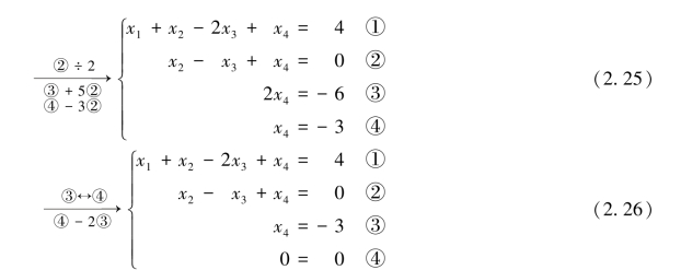 这里方程组(2.22)→方程组(2.23)是为消x1作准备.方程组(2.23)→方程组(2.24)是保留式①中的x1,消去式②,式③,式④中的x1.方程组(2.24)→方程组(2.25)是保留式②中的x2,并把它的系数变为1,然后消去式③,式④中的x2,与此同时,恰好把x3也消去了.方程组(2.25)→方程组(2.26)是消去x4,与此同时恰好把常数也消去了,得到恒等式0=0(若常数不能消去,则会得到矛盾方程0=1,从而说明方程组无解).至此,消元完毕.