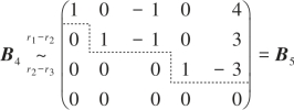由行最简形矩阵B5,即可写出方程组(2.22)的解(2.27);反之,由方程组的解(2.27)也可写出矩阵B5.由此可猜想到,一个矩阵的行最简形矩阵是唯一确定的(行阶梯形矩阵中非零行的行数也是唯一确定的).