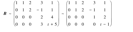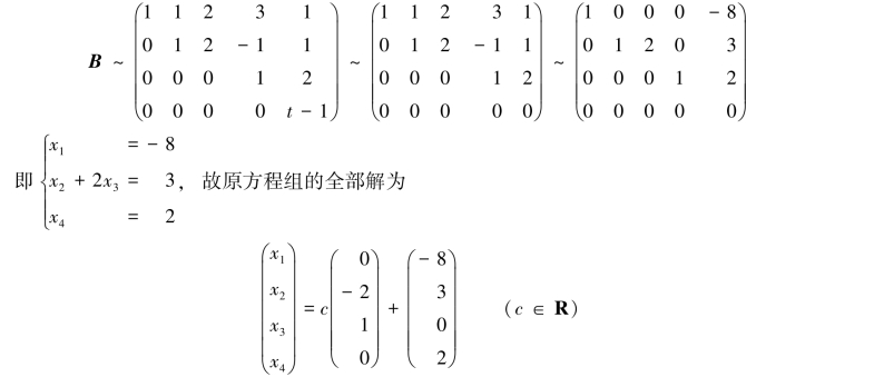 当t≠1时,R(A)=3<R(B)=4,方程组无解;
