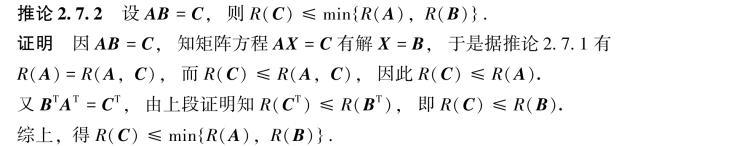 利用推论2.7.1,容易得出矩阵的秩的性质(7),即